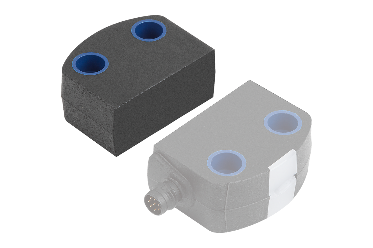 Actionneur pour capteur de sécurité RFID. Si l'actionneur se trouve dans la plage de la distance de commutation (porte de sécurité fermée), les sorties à semi-conducteur de du capteur de sécurité sont commutées.