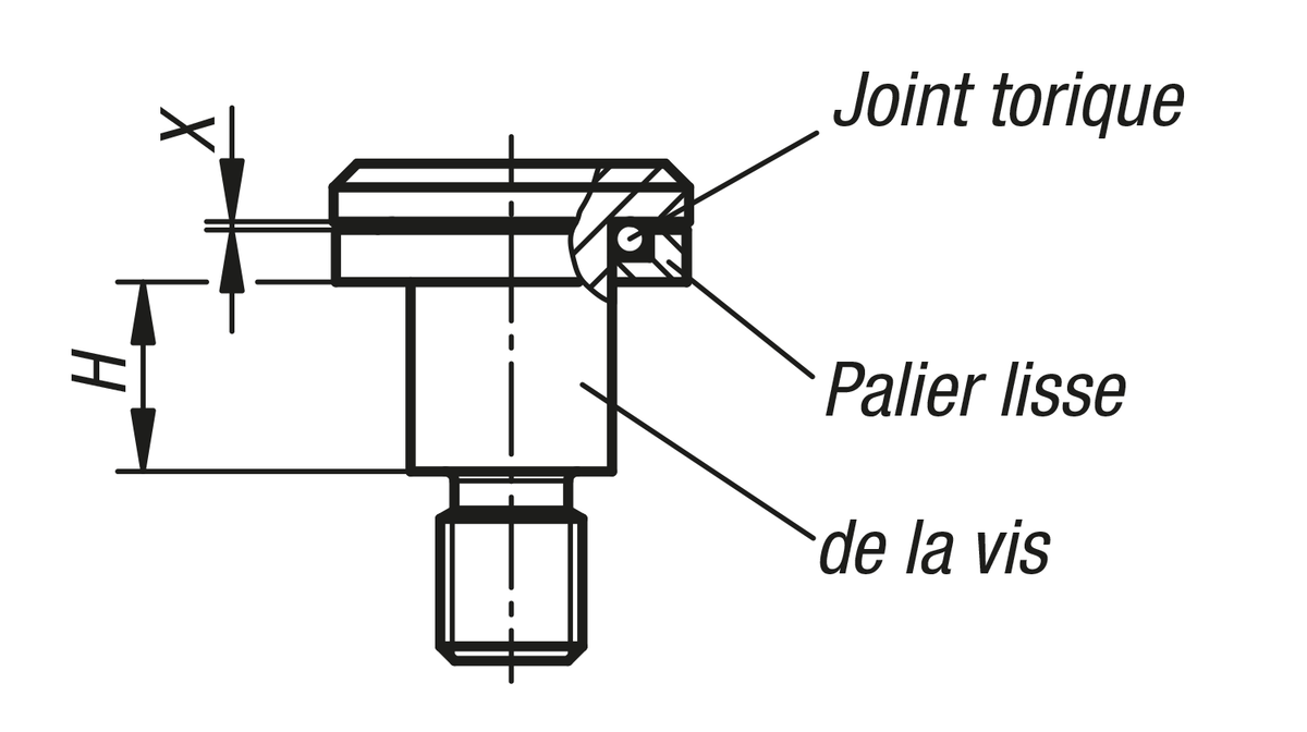 Lorsque la tige est vissée dans l'alésage, le palier lisse vient comprimer le joint torique. Cette compression peut aller jusqu'à la cote X. Ensuite, le palier lisse vient reposer sur la tête de la tige. La course est limitée en conséquence par la cote de montage H +0,2. Un montage flottant est ainsi toujours garanti.