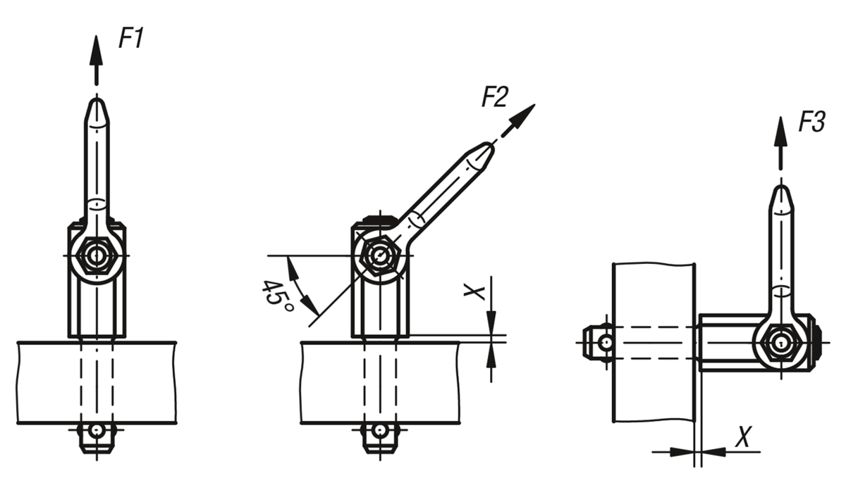 Les valeurs X min, F1, F2 et F3 sont conformes à la norme DIN EN 13155, et la charge de test correspond à 3 fois la charge nominale.