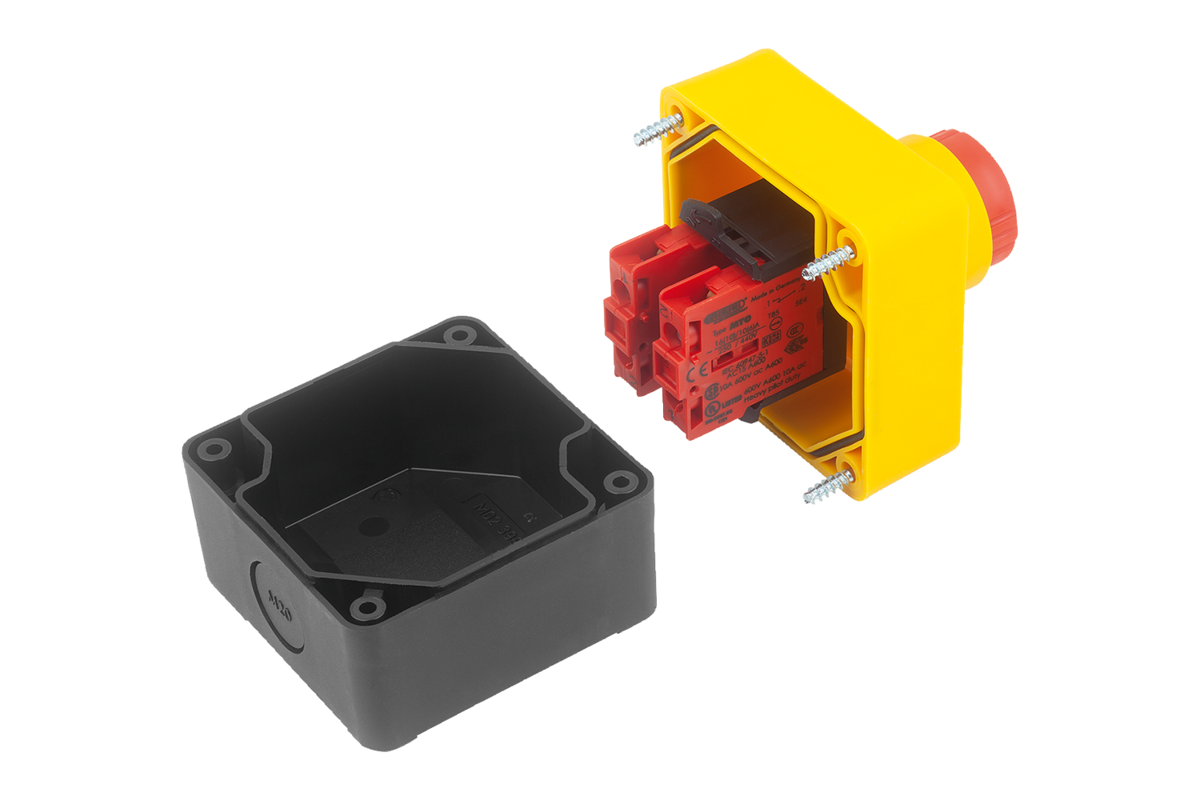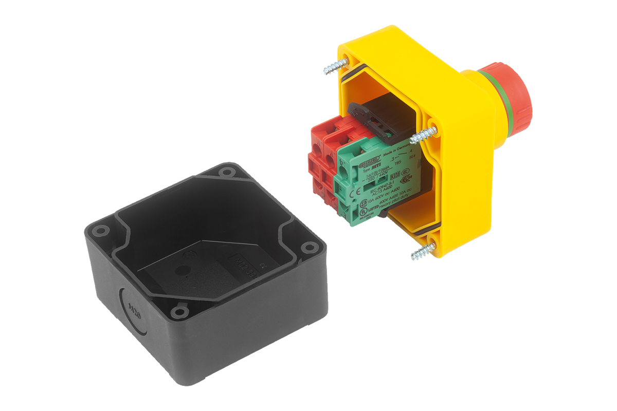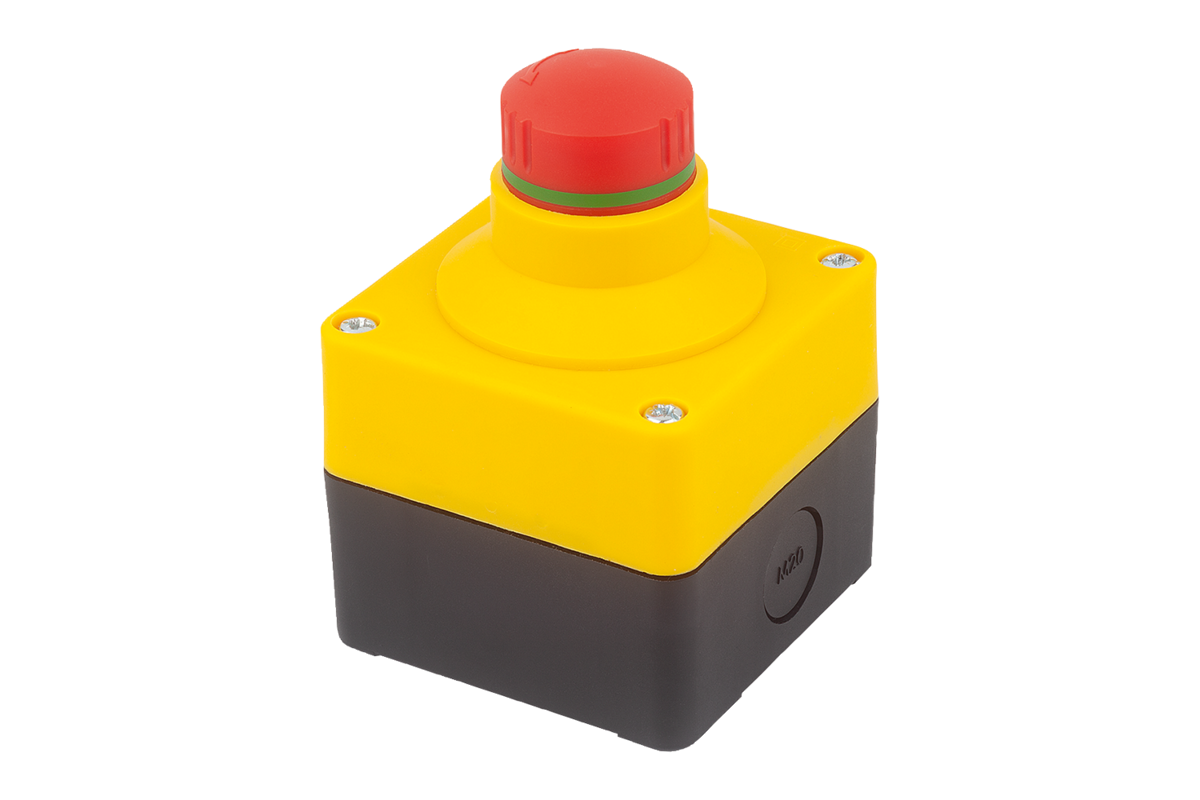 I pulsanti di emergenza servono per la disattivazione manuale di macchine e impianti in caso di pericolo. Il pulsante si blocca all'attivazione e può essere sbloccato ruotando verso destra o verso sinistra. Il pulsante rosso è posizionato su un fondo giallo. In tal modo è facilmente riconoscibile.