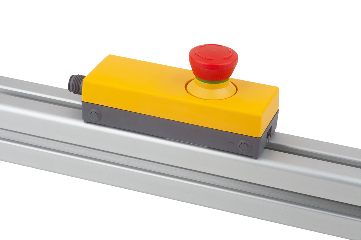 Il Minibox è un alloggiamento completo, preconfezionato, comprendente il pulsante di emergenza. La forma sottile dell'alloggiamento è idonea soprattutto per il montaggio su profili in alluminio.