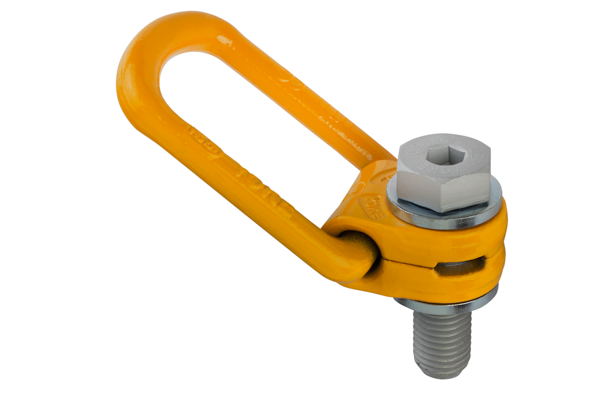 Anello di sollevamento e staffa a vite forgiati e temprati ad alta resistenza. Rilevamento di incrinatua elettromagnetico al 100%, rivestimento in plastica, giallo.