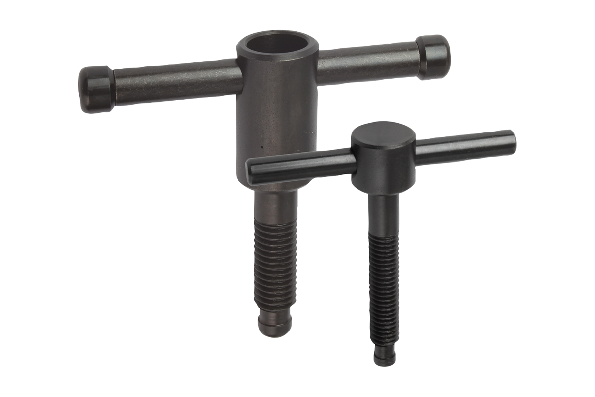 Nei dadi a T con leva mobile, la leva è spostabile e viene fissata in qualsiasi posizione con la molla di compressione. Gli anelli limitano lo spostamento.