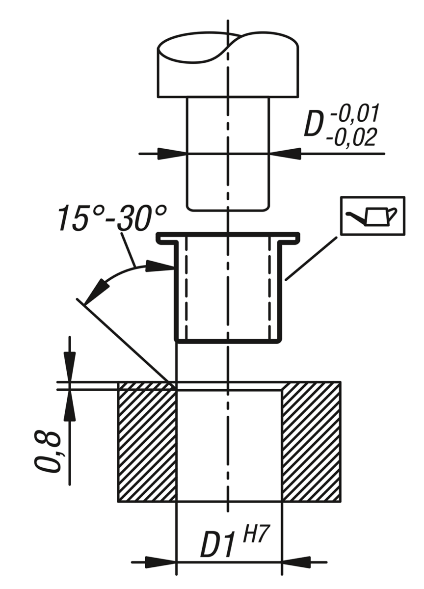 Inserire a pressione il cuscinetto radente, non montare con forza. L'uso di una spina di iniezione passante è consigliato. Senza di essa si corre il pericolo che il cuscinetto radente si deformi al momento dell'assemblaggio. Dopo l'inserimento a pressione nell'alloggiamento con foro di alloggiamento H7, il foro D ha una tolleranza pari a H7.