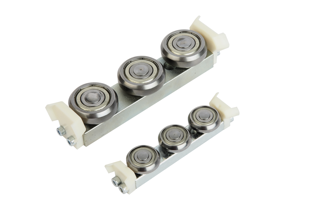 Carrelli di guida a rulli con cuscinetto a rulli con lubrificazione permanente ed estrattore in poliammide che proteggono le vie di corsa dallo sporco.