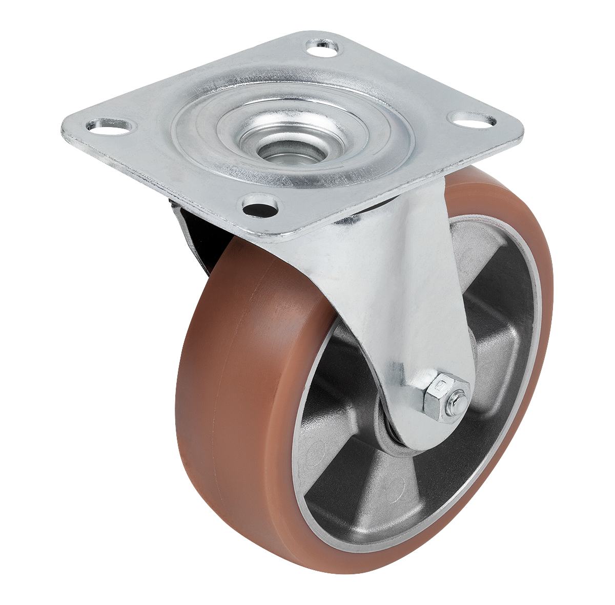 Alloggiamento pressato. Alloggiamento orientabile con doppio cuscinetto a sfera nella corona girevole. Ruote con cuscinetto a sfera.