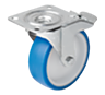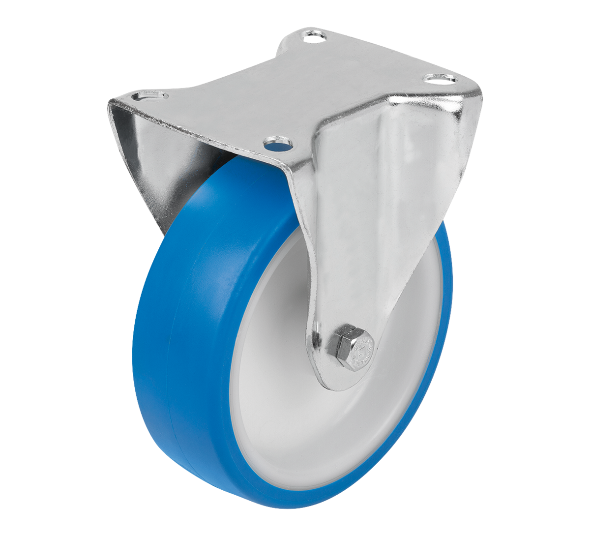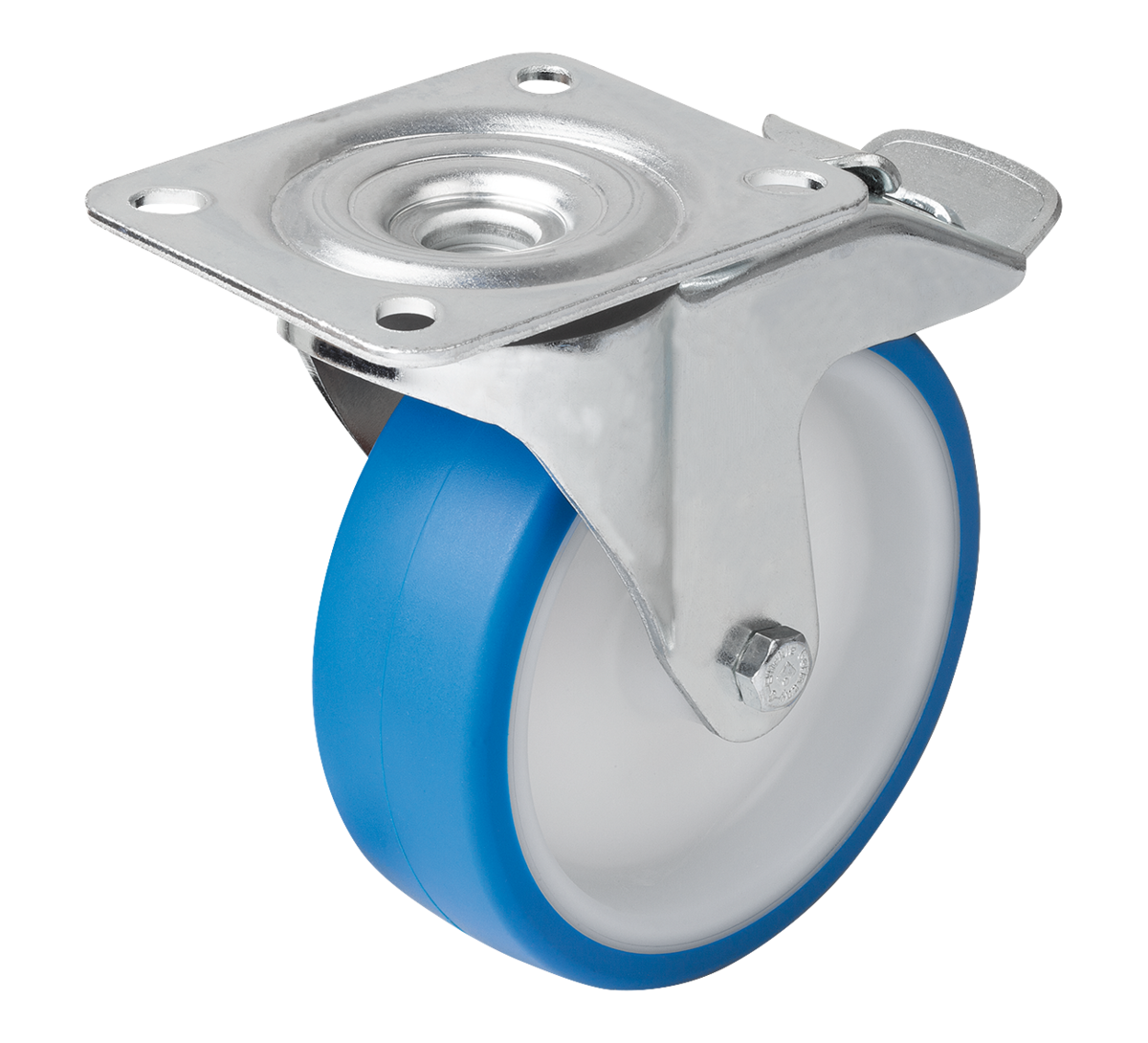 Alloggiamento pressato. Alloggiamento delle rotelle orientabili con doppio cuscinetto a sfere nella corona girevole. Ruote con cuscinetto radente.