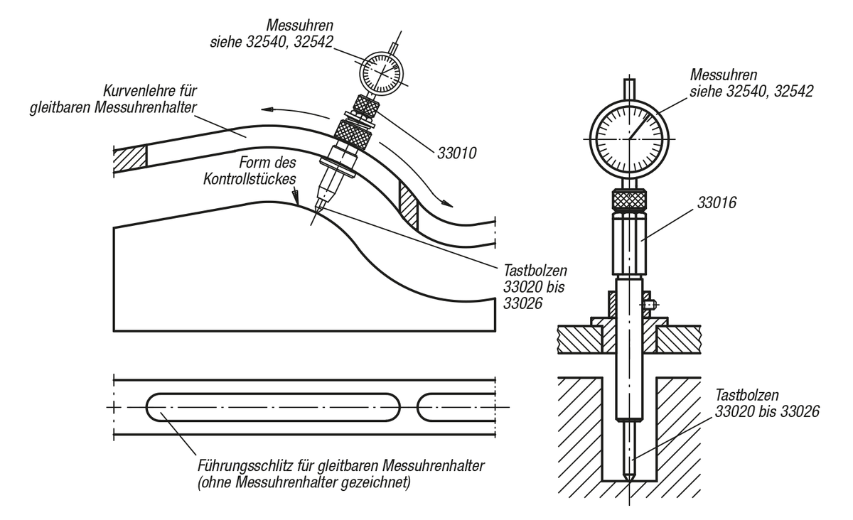 Die Lieferung erfolgt ohne Messuhr und Tastbolzen. Messuhren siehe 32540 und 32542. Tastbolzen siehe 33020 bis 33026.