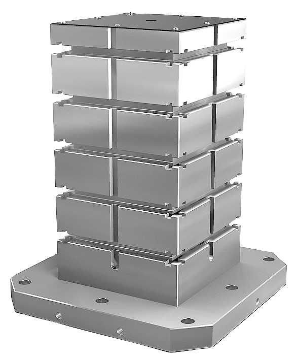 Aufspannwürfel mit T-Nuten werden zum Aufbau von modularen Vorrichtungen auf horizontalen Maschinen eingesetzt.