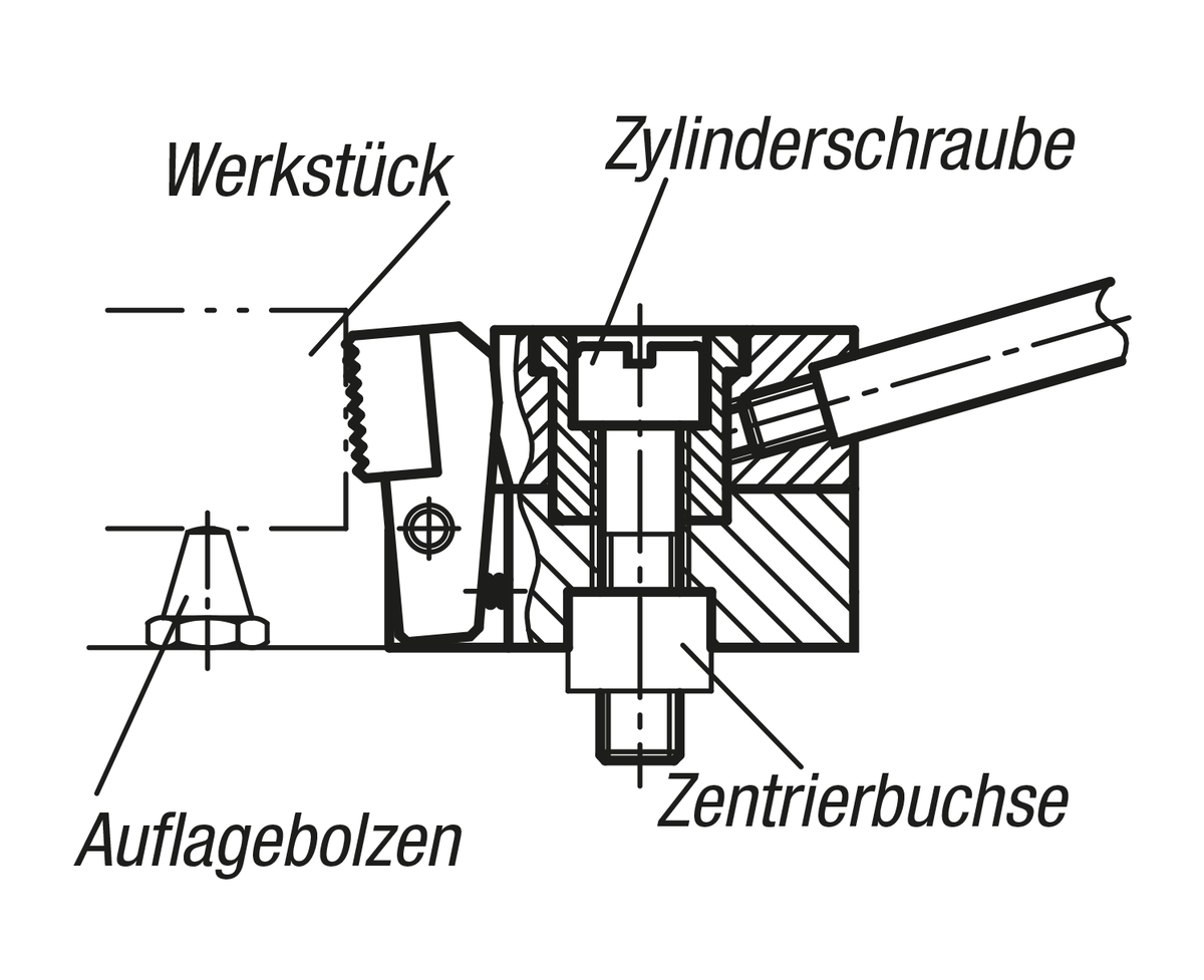 Der Niederzugspanner ist ein Schnellspannelement, mit dem Werkstücke durch den Schwenkbacken über den Spiralexzenter gleichzeitig an die Festanschläge und auf eine Auflage gedrückt werden. Der Niederzugspanner kann durch die Zentrierbuchse (siehe Zeichnung) auf einem modularen Rastersystem positioniert und gespannt werden. Die Ausführungen 04518-006010, 04518-006015, 04518-006030 und 04518-006035 haben 2 runde Hartmetalleinsätze.