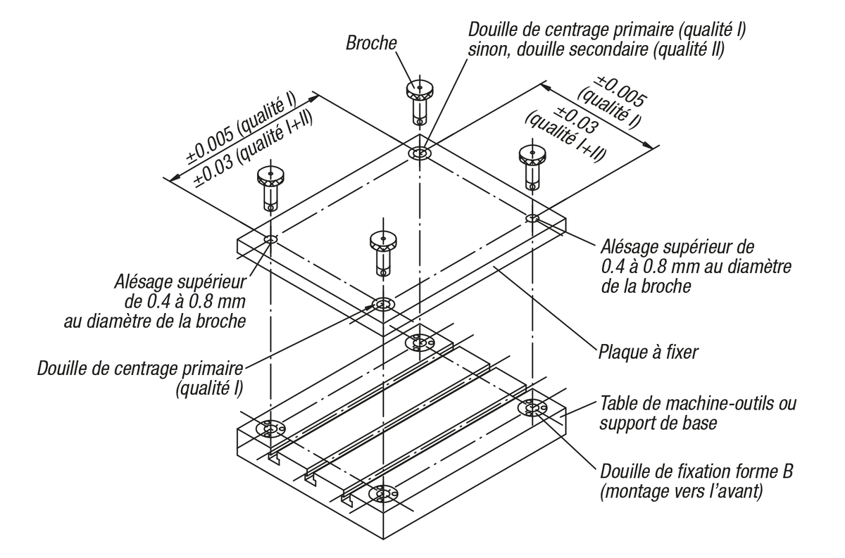 Avec une tolérance d’entraxe de ±0,005 mm et en utilisant deux douilles de centrage de classe I, il est possible d’obtenir une répétabilité de l’ordre de ±0,013 mm.