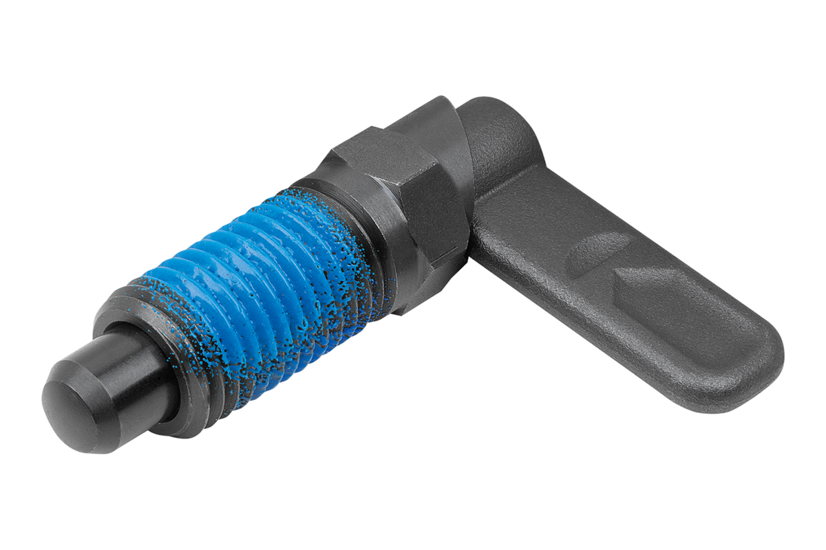 Les doigts d’indexage verrouillables sont utilisés lorsqu'il faut éviter tout déplacement de la position d'arrêt sous l'effet de forces transversales. Une rotation à 180° du verrou entraîne la rétractation du doigt d'arrêt, ce qui permet de modifier la position d'arrêt. L'encoche d’arrêt permet de maintenir le verrou dans cette position et le doigt d'arrêt rétracté.