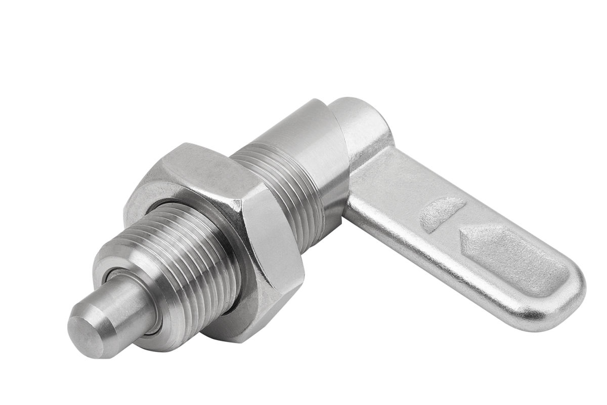 Les doigts d’indexage verrouillables sont utilisés lorsqu'il faut éviter tout déplacement de la position d'arrêt sous l'effet de forces transversales. Une rotation à 180° du verrou entraîne la rétractation du doigt d'arrêt, ce qui permet de modifier la position d'arrêt. L'encoche d’arrêt permet de maintenir le verrou dans cette position et le doigt d'arrêt rétracté.