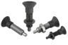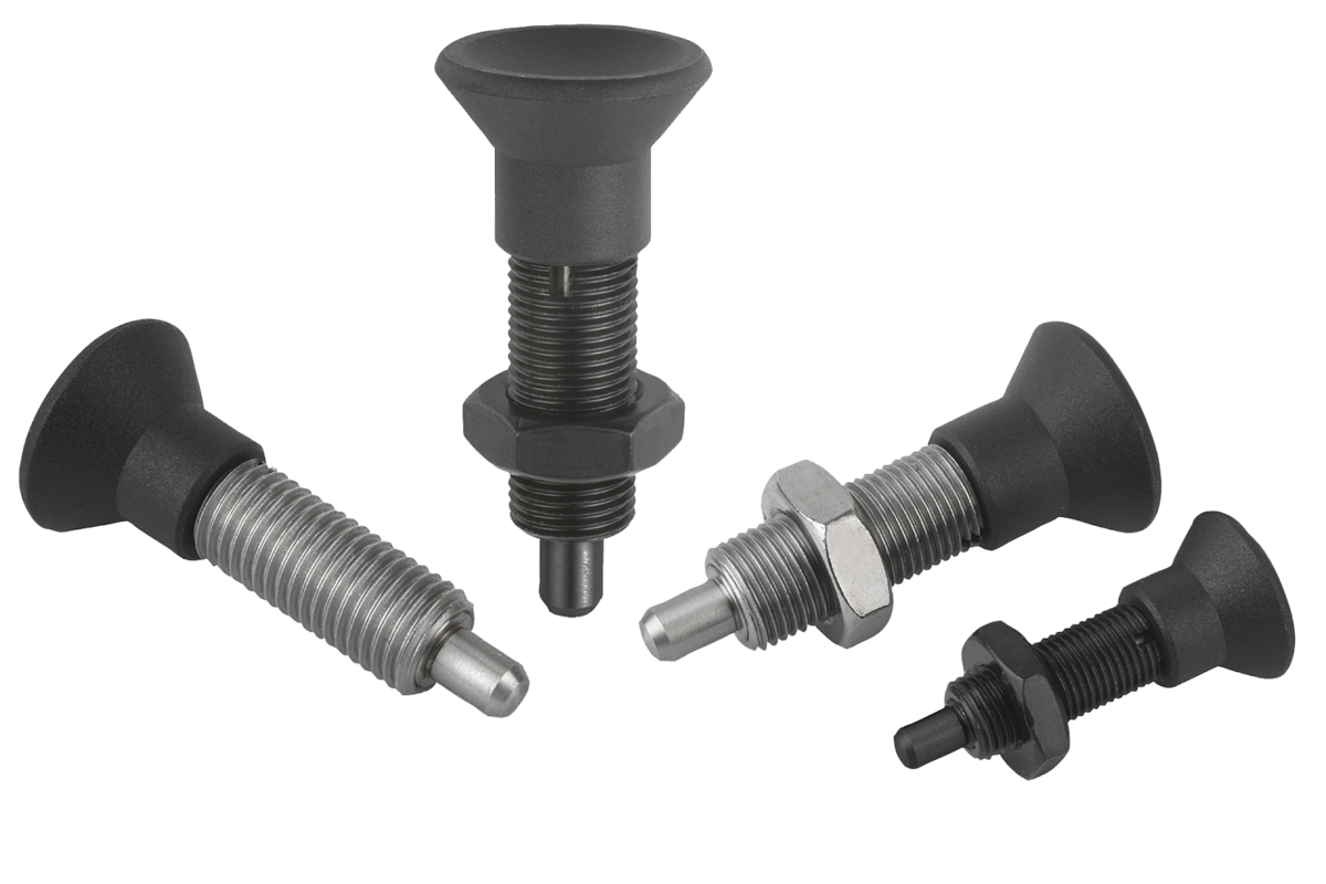 Doigts d’indexage en acier ou en inox, sans embase, avec bouton de manœuvre en plastique et doigt d’arrêt allongé, sans contre-écrou