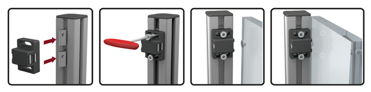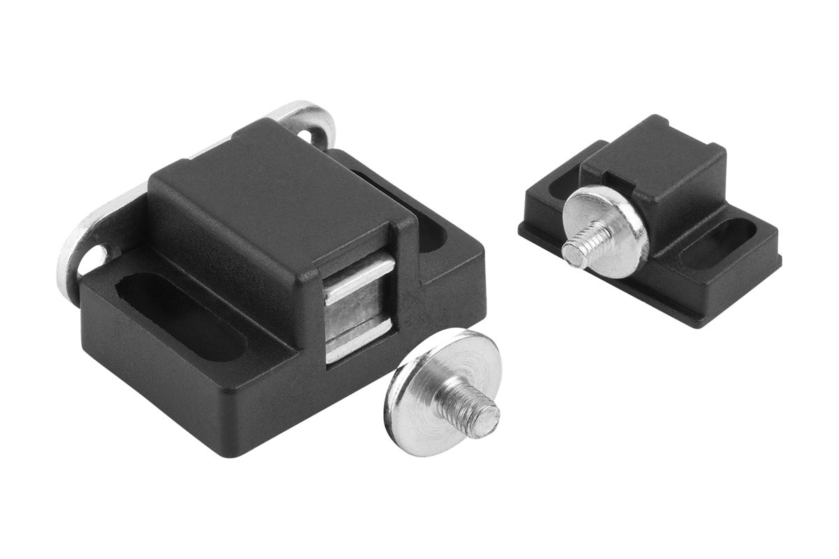 Fermeture magnétique pour portes battantes et coulissantes. Les trous oblongs permettent un positionnement flexible sur des profilés aluminium et des éléments plans.