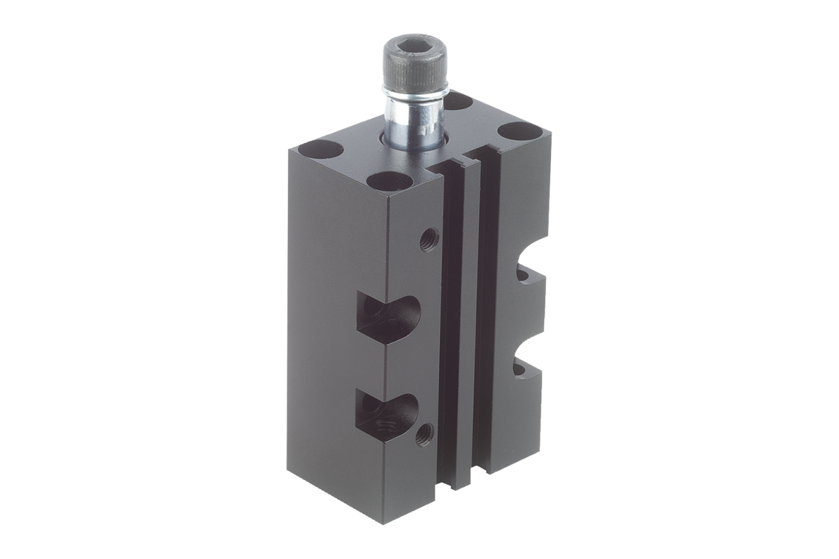 Le piston à détection magnétique permet l‘utilisation de détecteurs de fin de course. La vis et la rondelle élastique sont fournis pour la fixation du bras de serrage accessoire. Le vérin de bridage pivotant ne doit pas être gêné lors du mouvement de rotation.