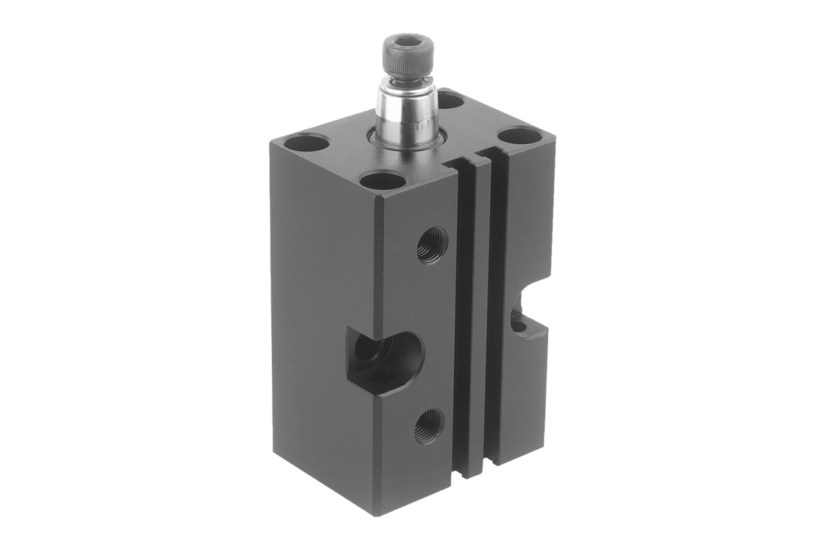 Le piston à détection magnétique permet l‘utilisation de détecteurs de fin de course. La vis et la rondelle élastique sont fournis pour la fixation du bras de serrage accessoire. Le vérin de bridage pivotant ne doit pas être gêné lors du mouvement de rotation.