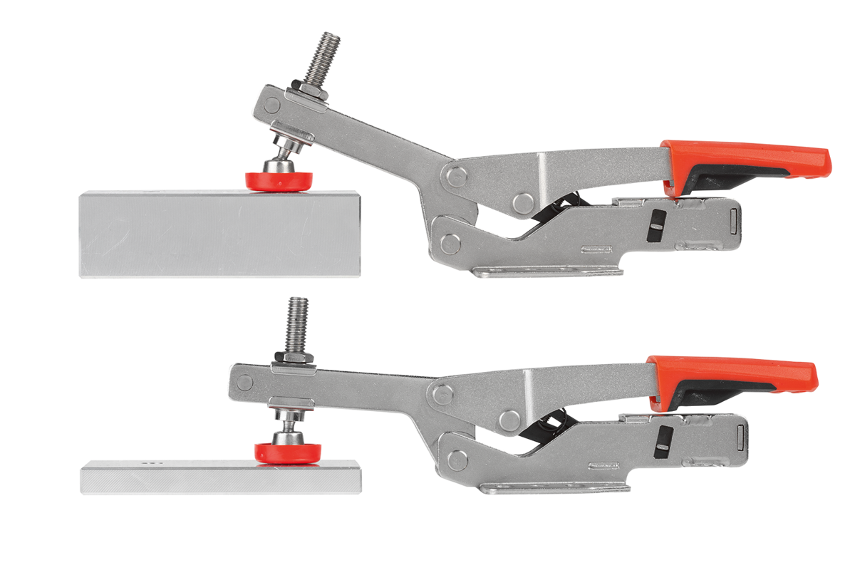 La sauterelle s'ajuste automatiquement à la hauteur de la pièce à bloquer. Ajustement en continu de la hauteur de serrage dans la limite de 35 mm pour une force de serrage à peu près constante ou modification manuelle de la position de la vis de pression.