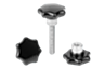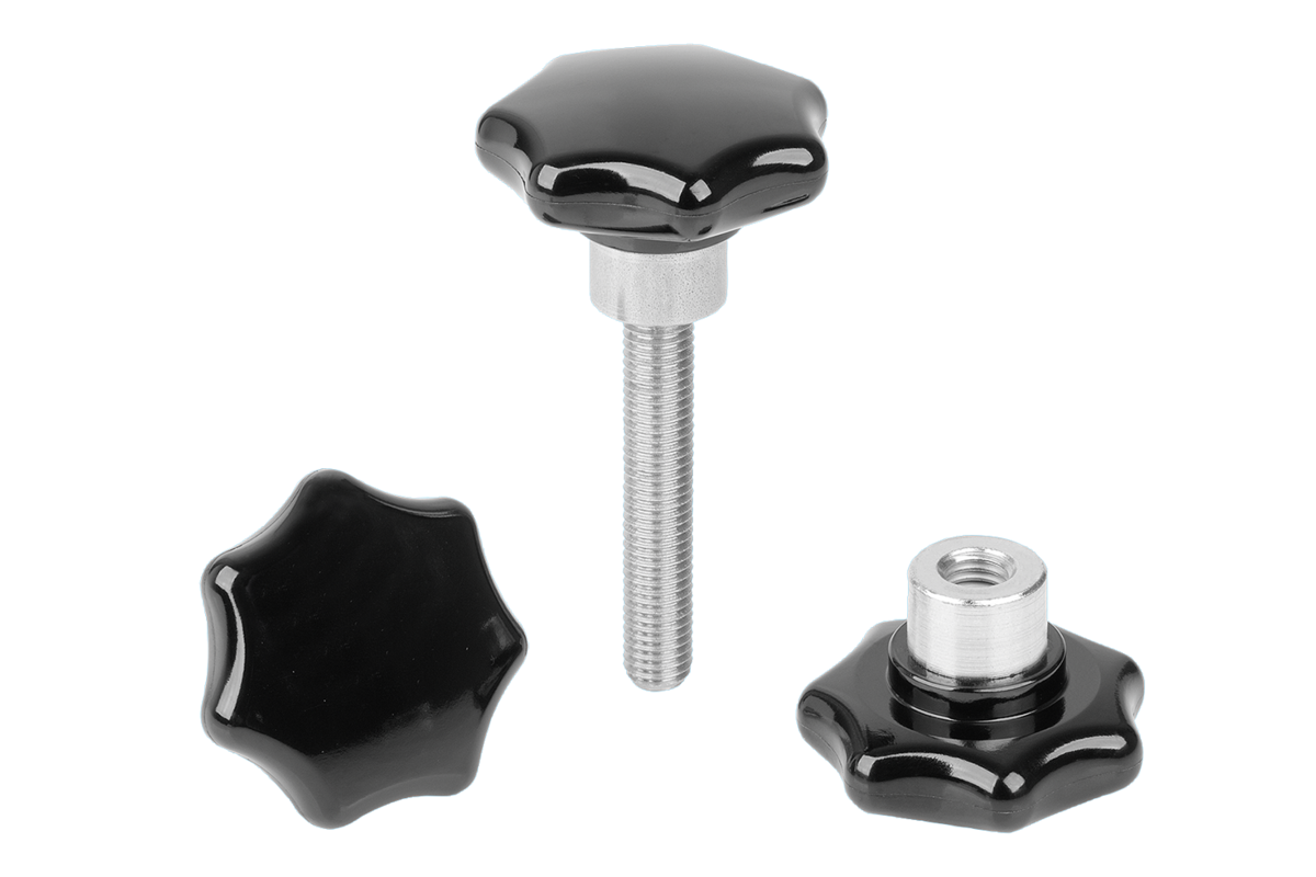 Le bouton étoile en plastique thermodurcissable se caractérise par un contour de poignée fermé. La surface de contact de la douille en acier saillante est perpendiculaire à l'axe de filetage et permet un raccord vissé stable.