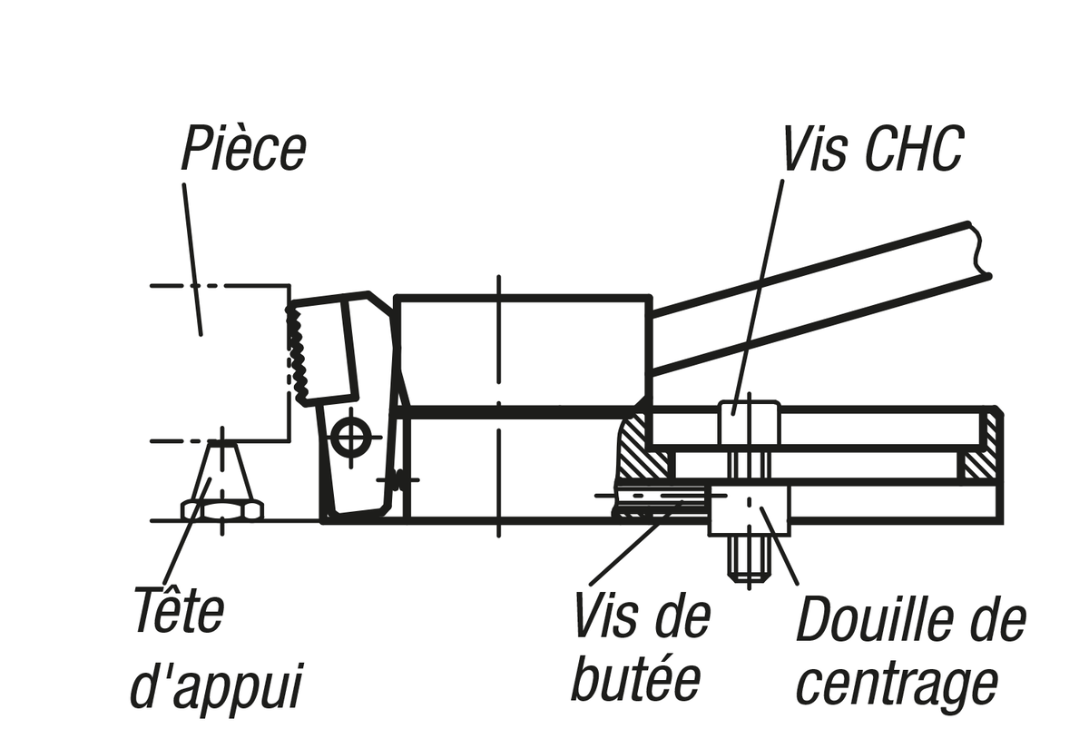 Le crampon plaqueur à came est un élément de serrage rapide, permettant de serrer les pièces à usiner par l’action du levier à came. Le crampon plaqueur à came se positionne et se fixe à l’aide de la douille de centrage et de la vis de butée (voir schéma). La vis de butée permet après réglage d’empêcher le recul du crampon en reportant les efforts de serrage directement sur la douille de centrage. Pour réf. 04516-006010, 04516-006015, 04516-006030 et 04516-006035 : Exécution en 2 inserts ronds en carbure.