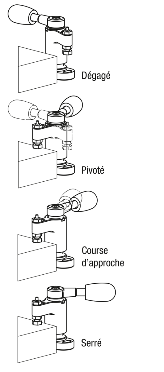 Les ensembles de bridage pivotants sont utilisés afin de laisser le champ libre pour placer ou enlever la pièce à usiner. * Force manuelle admissible pour la poignée.