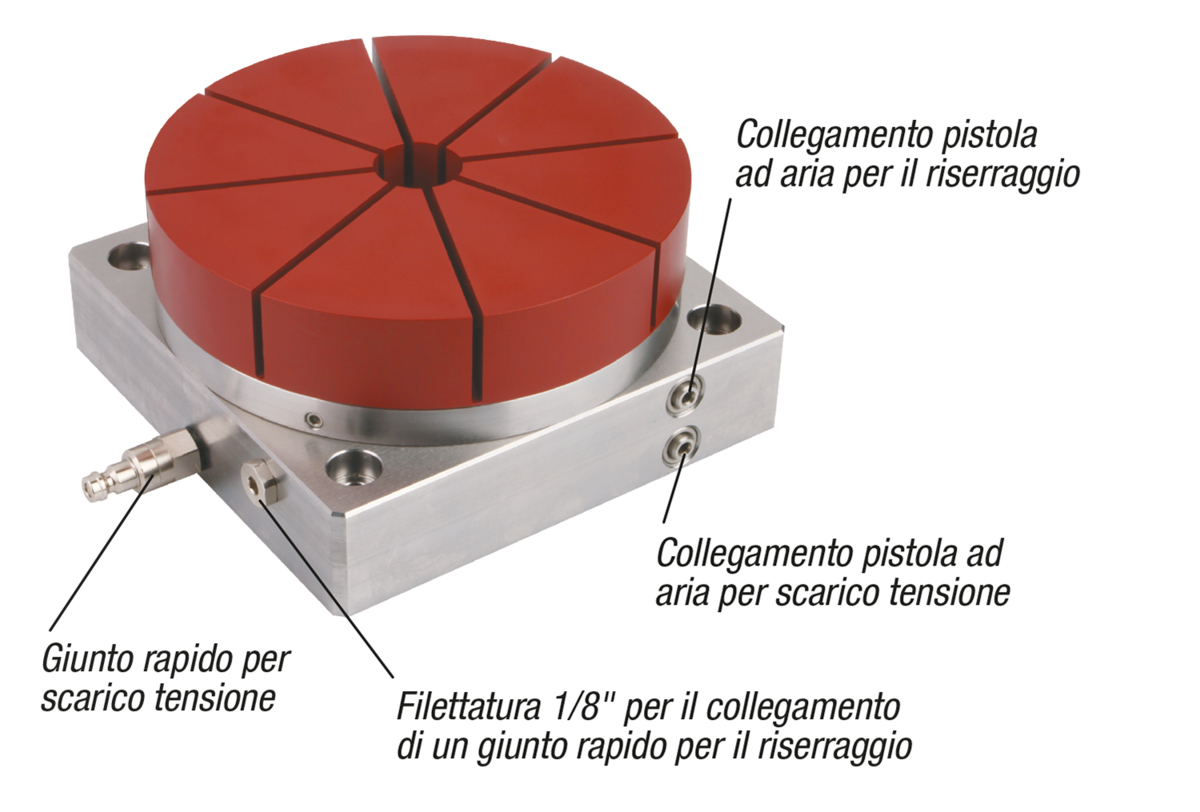 Il pacchetto di molle integrato produce una forza di serraggio di 5,8 kN. Mediante un serraggio successivo con aria compressa, la forza di serraggio può essere aumentata fino a 43,5 kN. L'allentamento del tenditore avviene inserendo aria compressa sulla superficie inferiore dei pistoni. In questo modo i pistoni sono spinti verso l'alto e allentano il serraggio delle pinze.