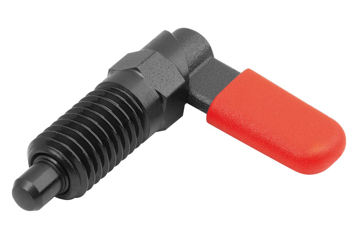 I perni di arresto con leva sono utilizzati per impedire una modifica della posizione d'arresto per effetto di forze trasversali. Il perno di bloccaggio si ritrae ruotando di 180° la barra di bloccaggio; in questo modo è possibile modificare la posizione di arresto. La tacca di bloccaggio mantiene la barra di bloccaggio in questa posizione e quindi il perno di bloccaggio rimane rientrato.