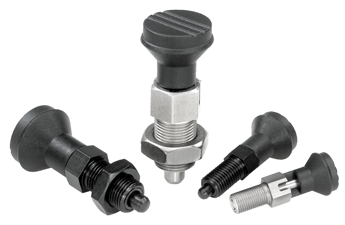 Spine di posizione in acciaio o acciaio inox con impugnatura a fungo in plastica, con coperchio, con incavo d'arresto e controdado