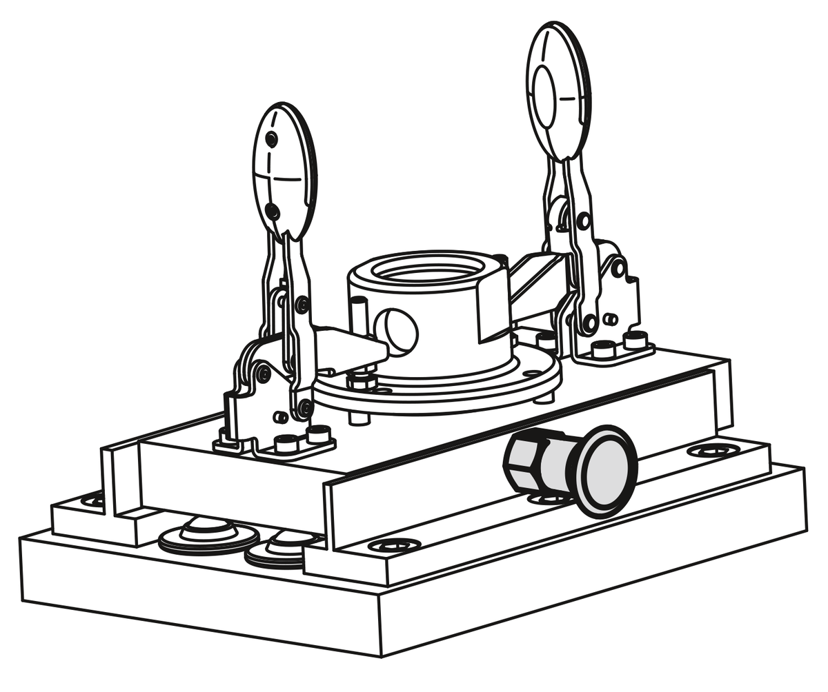 Per l'avvitamento delle spine di posizione può essere fornita una rondella per avvitamento. Questa va inserita sotto l'impugnatura a fungo sbloccata, in modo che le spine di trascinamento facciano presa sull'intaglio.