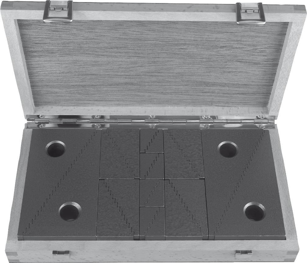 La dentellatura speciale consente l'utilizzo di tali blocchi di interposizione in posizione verticale e orizzontale. Il set completo in cassa di legno si compone di 20 parti intercambiabili che offrono numerose possibilità di applicazione. Questi blocchi di interposizione possono essere anche acquistati singolarmente. Vedere 02270. I blocchi di interposizione universali sono utilizzabili anche in combinazione con le staffe di bloccaggio dentellate 04070.